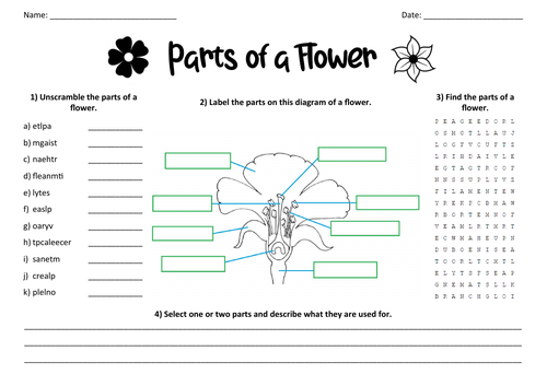 Science worksheets: Label parts of a flower - Made By Teachers Students have to label the different parts of a flower (Petals,Stigma,Anther, Ovary, Sepals ,Stamen) Students then have to write a sentence describing the function of each part. Word bank provided. Students can color in the flower once they are finished. Worksheet aimed at primary level.