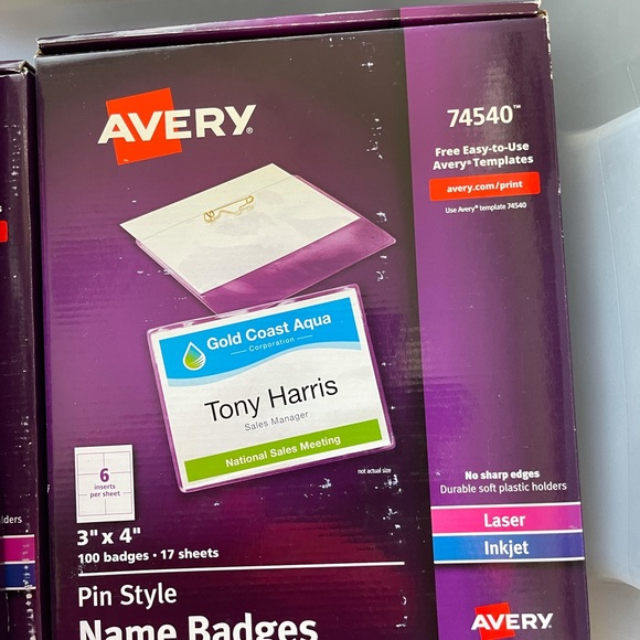 Avery® 74540 4" x 3" White Horizontal Laser / Ink Jet Name ... Avery® 74540 4" x 3" White Horizontal Laser / Ink Jet Name Badge and Top-Loading Pin Holders - 100/Box Leave a review Item #: 15474540 MFR #: 74540 Works With Quantity Discounts Buy in lots of 5: $19.65 /Box Ships free with Plus Regularly: $19.99 /Box You must buy a minimum of 5 at a time due to manufacturer packaging. Wish List Rapid Reorder